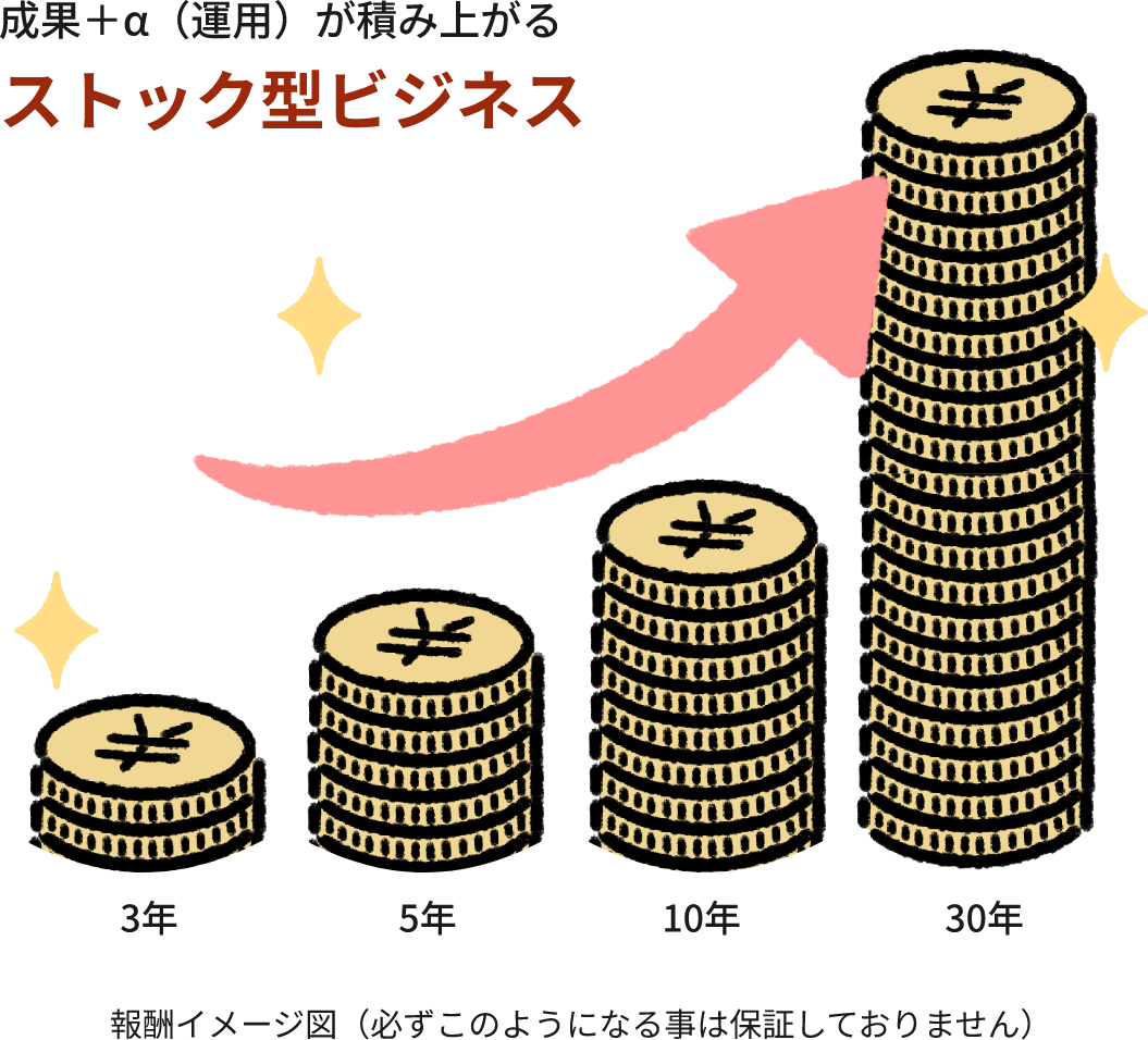 投資信託の場合、販売手数料は購入時のみですが、信託報酬から得られる収益は、お客様の資産残高と完全に連動しています。つまり、お客様に提案・販売した資産形成商品が何倍にも成長すれば、あなたの報酬も連動してアップする仕組みです。